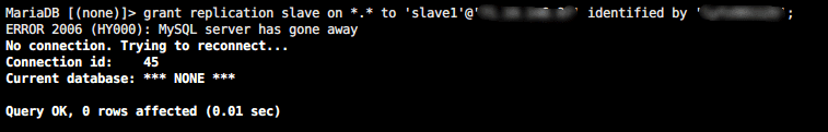 grant replication slave on \*.\* to '用户名'@'从服务器 B 的 IP' identified by '用户密码';grant replication slave on \*.\* to '用户名'@'从服务器 B 的 IP' identified by '用户密码';需要在把上面命令的用户名,密码和从服务器的 IP 换成你自己的。下面是一个例子: