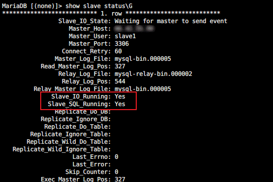 show slave status\\Gshow slave status\\G请务必确保 Slave_IO_Running 和 Slave_SQL_Running 的值都是 yes ,就表示成功了,如果任何一个是 NO 那就说明没有成功。博主由于没有将 WordPress 进入维护模式,所以 File 和 Position 数值变化导致启动失败。