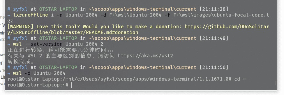 有了要转换的发行版后我们就可以用以下命令将 WSL1 转换成 WSL2 了。