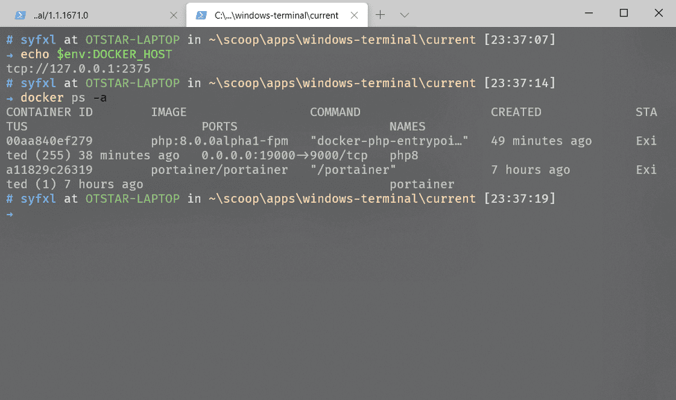 使用此脚本安装的 Docker 已经预先配置好了tcp:2375端口,Windows 下只需设置 DOCKER_HOST 的环境变量就可以无痛使用 Docker 和 Docker-Compose,而无需安装 Docker for Windows,同时在 WSL1 中也可以通过这种方式使用 WSL2 中的 Docker(不过一般也不需要,WSL1/2 中可以直接使用 Windows 下的命令和程序。